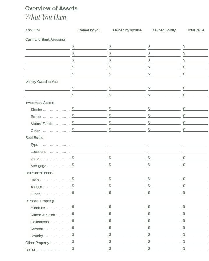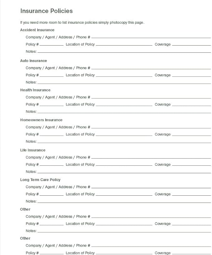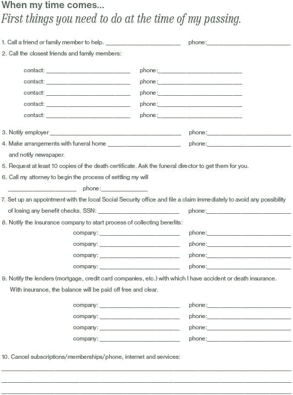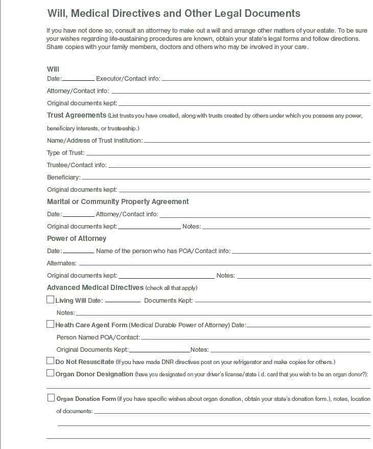 - This organizer contains sections for the following information: Personal Message to Loved Ones, Location of Personal Papers, Websites/Online Records, Important Contacts, Insurance Policies, Family Health History, Information on Medical Directives and Other Legal Documents, Wishes about Personal Property, Overview of Assets, Overview of Debts, Banking Information, Investment and Real Estate, Vehicles, Benefits You Can Expect, Burial/Cremation Choices, and Things to Do At The Time Of My Passing