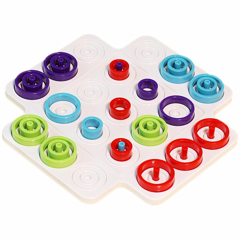 - LINE UP THE PIECES FOR THE WIN: Players compete to line up three pieces of the same color my similar size; in ascending or descending order; or within the same space.